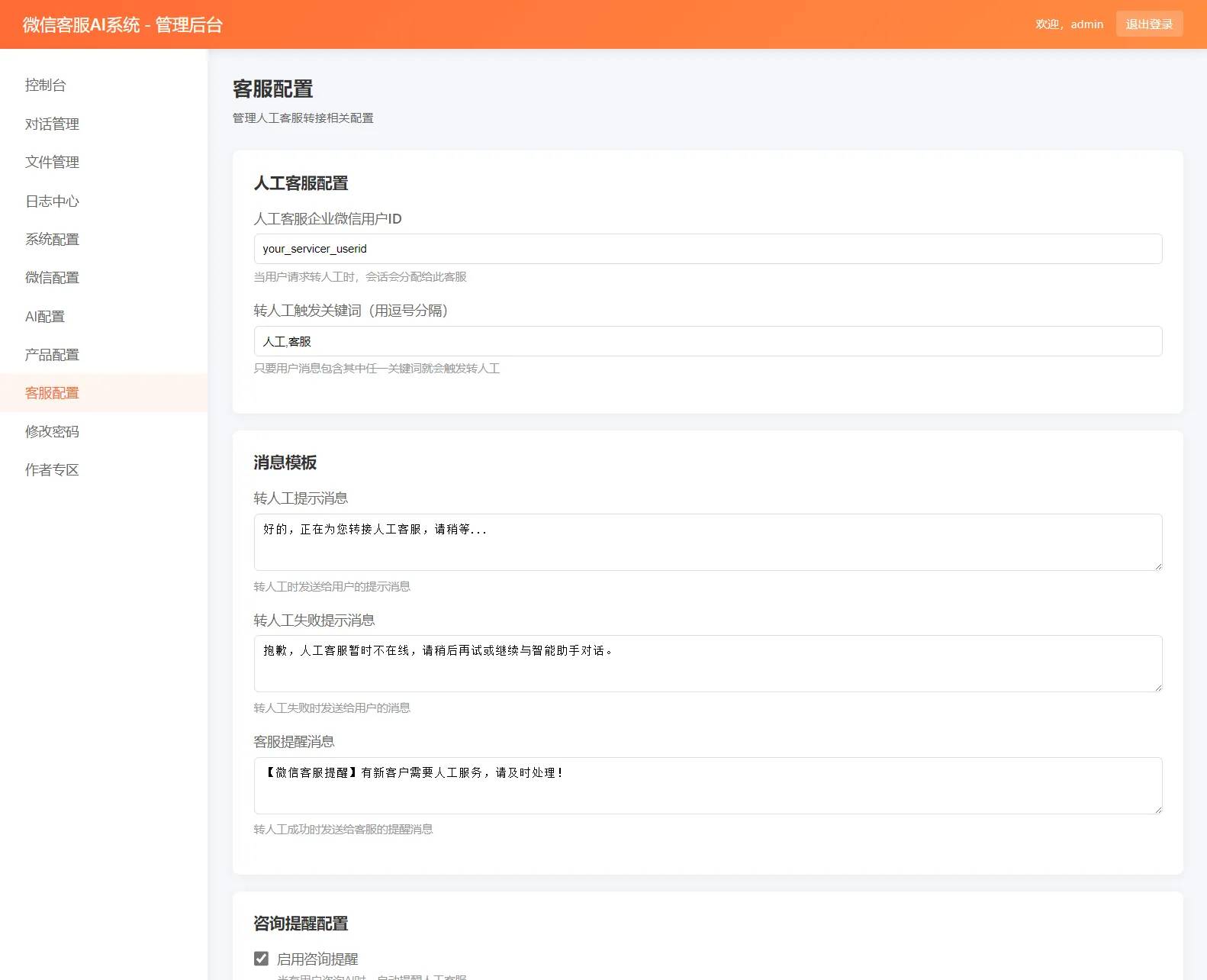 – **客服配置**:配置人工客服ID、转接关键词、提醒设置等