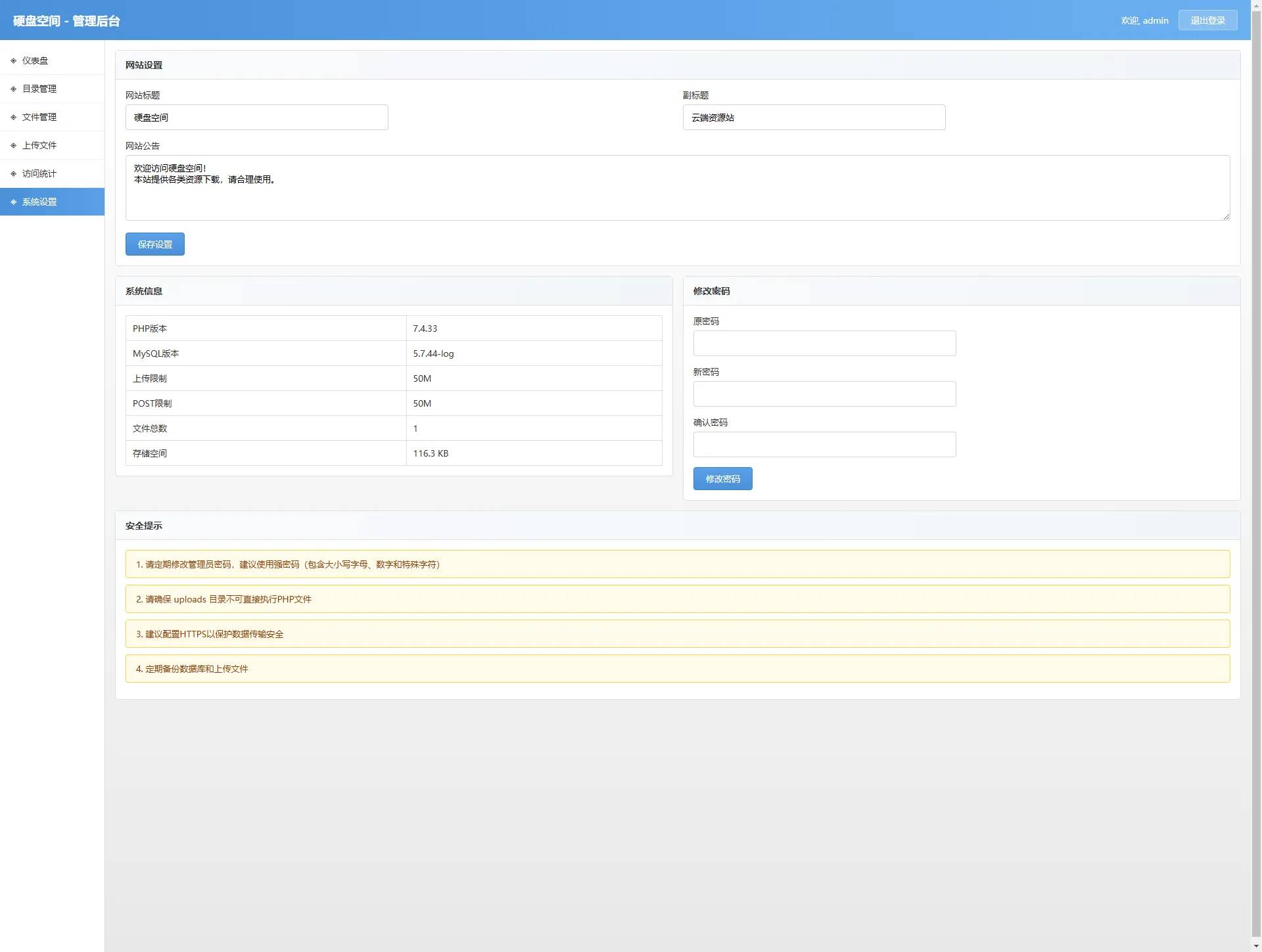 后台可自定义网站标题、副标题、公告